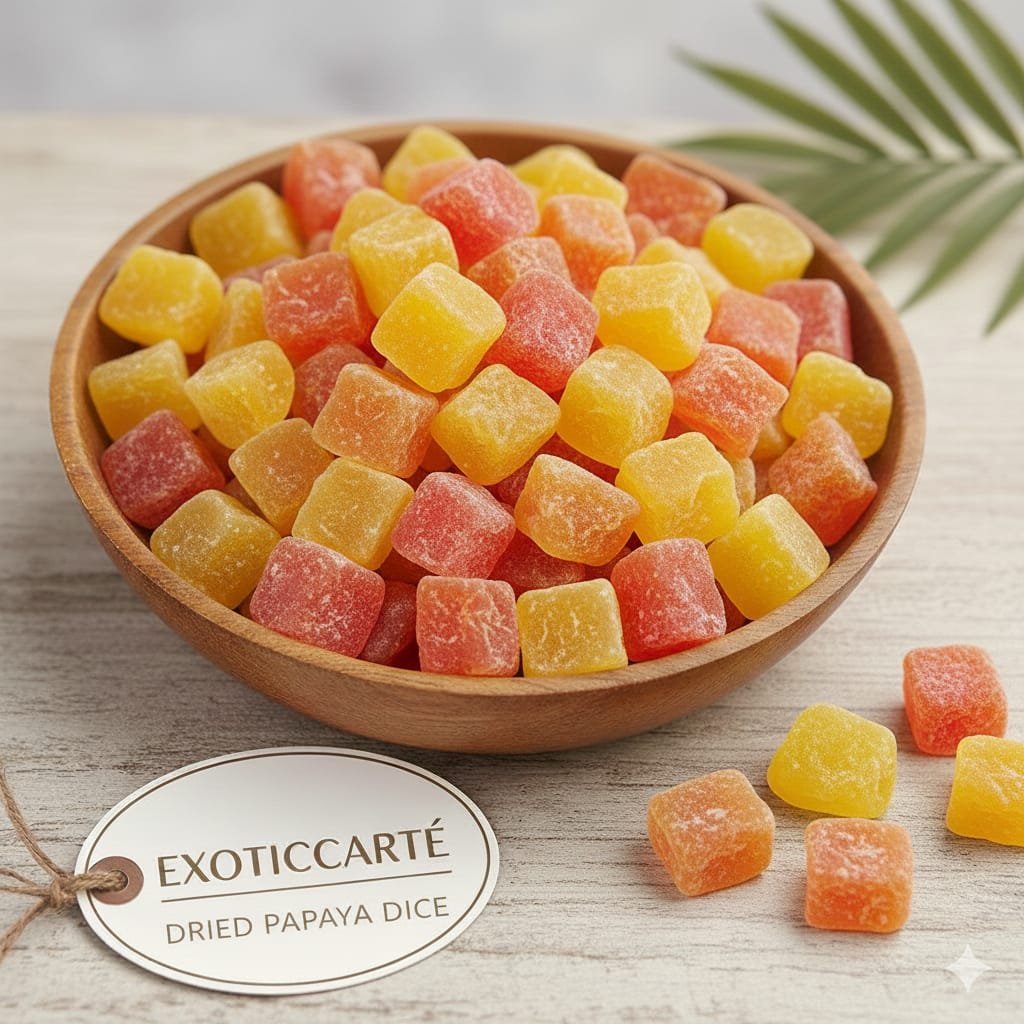 Papaya Dice tasty aur colourful dried papaya cubes hote hain jo premium quality papaya se banaye jaate hain. Inhe carefully cut karke hygienic process se dry kiya jata hai, taaki unka natural sweetness, bright colour aur soft-chewy texture bana rahe.